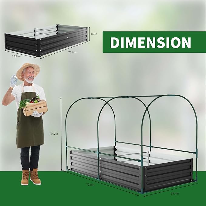 - Extended Growing Season: The dimensions of the galvanized raised garden bed are 71"*35.4"*45", and the dimensions of the raised garden bed with the greenhouse is 72.8"*37.4"*45". The attached greenhouse provides a controlled environment, allowing for year-round gardening