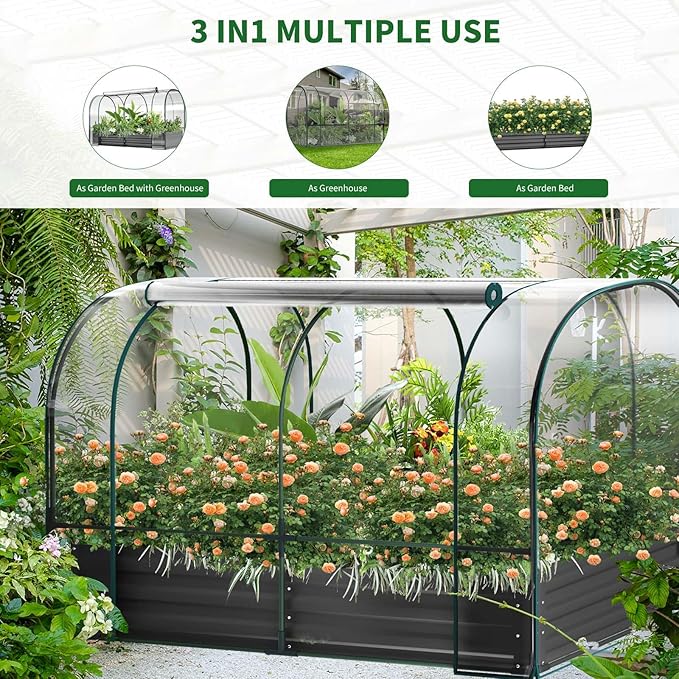 - Multifunctional Garden Bed with Greenhouse Kit: 2 in 1 Galvanized raised garden bed kit, 1 kit with 3 uses, can be used as a Raised garden bed, Removable mini greenhouse, Combination of garden bed with greenhouse. Meeting your different needs. Transparent PVC material, 100% sunlight penetration, more sunlight for plants, keep plants warm in winter