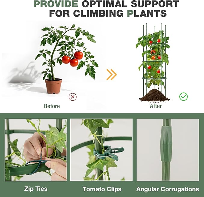 - 3 Pack Plant Support Trellis: The package includes 50 zip ties and 20 plant clips, providing you with all the necessary tools to protect your plants from sprawling out effectively. Additionally, the adjustable tomato trellis features angular corrugations that offer sturdy support for plants to cling.