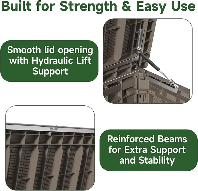 - ENHANCED SAFETY FEATURES - The EasyUp storage box features a hydraulic rod that allows for smooth lid opening and closing, reducing the risk of accidental pinching. The built-in locking mechanism adds an extra layer of security, making it ideal for safeguarding outdoor valuables.