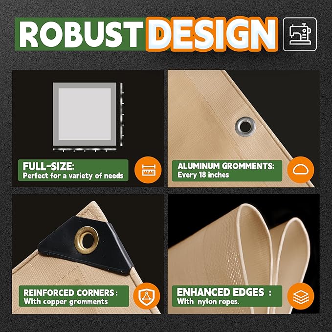 - 【12 Mil HEAVY DUTY TAN TARP】Extra thick tan tarp, 6 oz / sq yard on average, Made of tightly-woven polyethylene fibers,and has a 14 x 14 weave count, heavy duty waterproof tarp & rip and tear proof