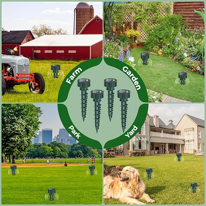 - Powerful Outdoor Mole & Snake Deterrent – Maintenance-Free: Effectively repels moles, snakes, gophers, groundhogs, and voles using low-frequency ultrasonic pulses powered by the sun. Once activated, the spikes work 24/7 with no need for charging or wiring—just place them in the soil and protect your lawn effortlessly
