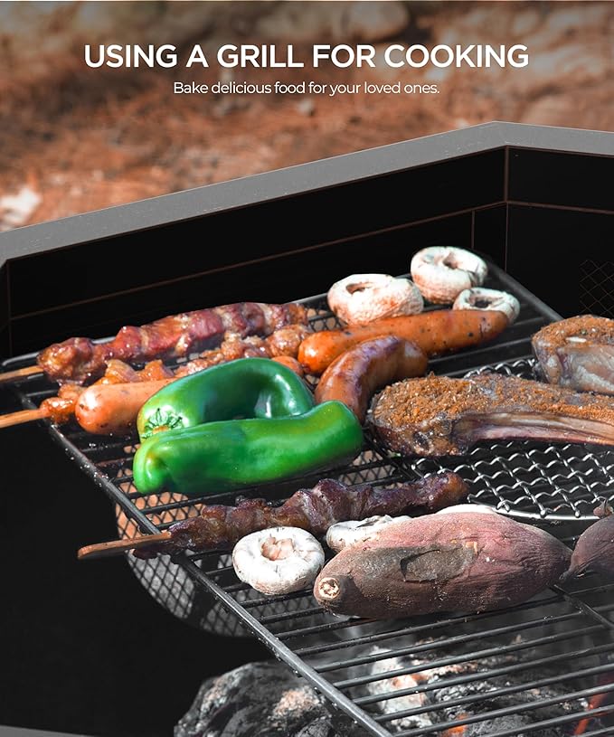 - 【VISUAL APPEAL & HUMANIZED STYLE】We have a cooking grill and a poker in our SUNOUTLY fire pit. You may cook with a pan on them, keep meals warm, or barbeque. When grilling, the poker is used to modify the wood fuel, which can help maintain a mild and even fire and encourage effective log burning.