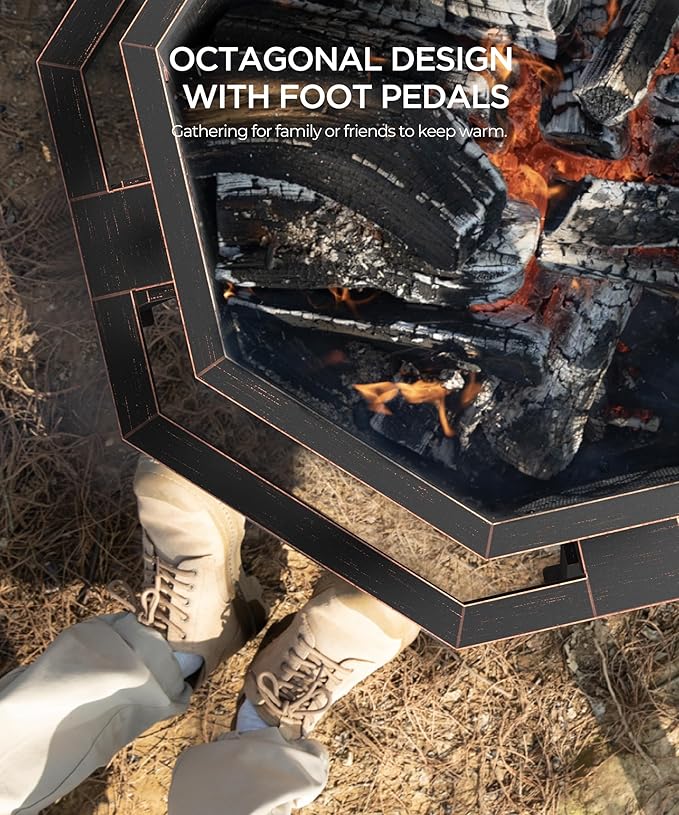 - 【OCTAGONAL FOOT PEDALS】Octagonal foot pedals of bonfire pit's outer ring designed to help maintain a safe distance between each other and enough room for optimal heating. Endless enjoyment in outdoor activities!