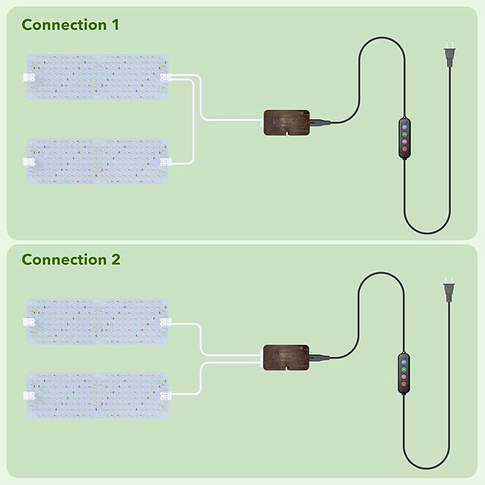 - [Modular LED Grow Panel with Daisy Chain Design] – This linkable grow light panel offers a professional solution for both hydroponic and green house. Easily connect up to 10 panels in series or parallel using the included 8.2ft power cord and 3.28ft link wires. Ideal for small to big indoor setups—whether a 3x3 or 4x4 grow tent, shelf, or commercial greenhouse.
