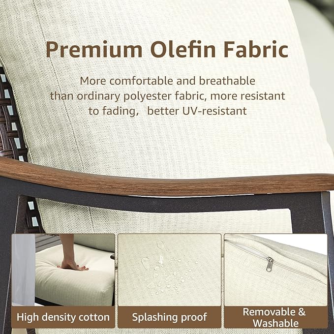 - 【Premium Olefin Fabric & Removable Cushion Cover】This metal outdoor furniture set features soft Olefin fabirc, which is more comfortable and breathable than ordinary polyester fabric, more resistant to fading,better UV-resistant.The cushions covers are waterproof, and the water drops on the surface can be wiped off with a paper towel, and they have zippers, easy be removed for washing