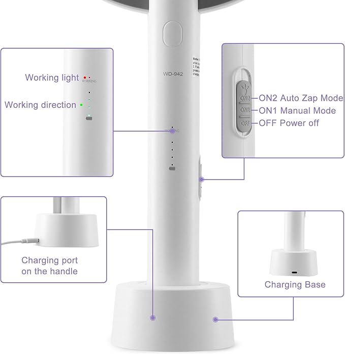 - 【2 Modes Function】: ON1 manual mode, press and hold the electric fly swatter's high-voltage button can kill flying mosquitoes. ON2 auto mode, the electric bug swatter is placed into the charging base, purple light high-pressure will attract insects to the high-volt grid and then shock them.