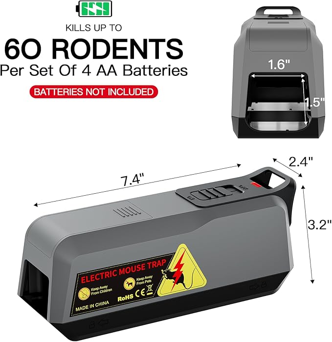 - Easy to Use - Simply place the bait and position the electric mouse trap in the rodent-infested area, with LED indicators and audible alarms providing clear status updates.