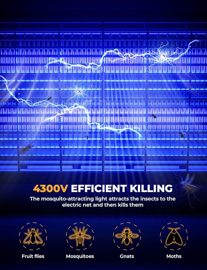 - (4300V More Powerful with Attractant Light) This electric bug zapper with 4300V power and 365nm light attract and zap insects effectively. It has a dense plastic protective mesh that shields against accidental touchesattract and zap insects effectively. It has a dense plastic protective mesh that shields against accidental touches