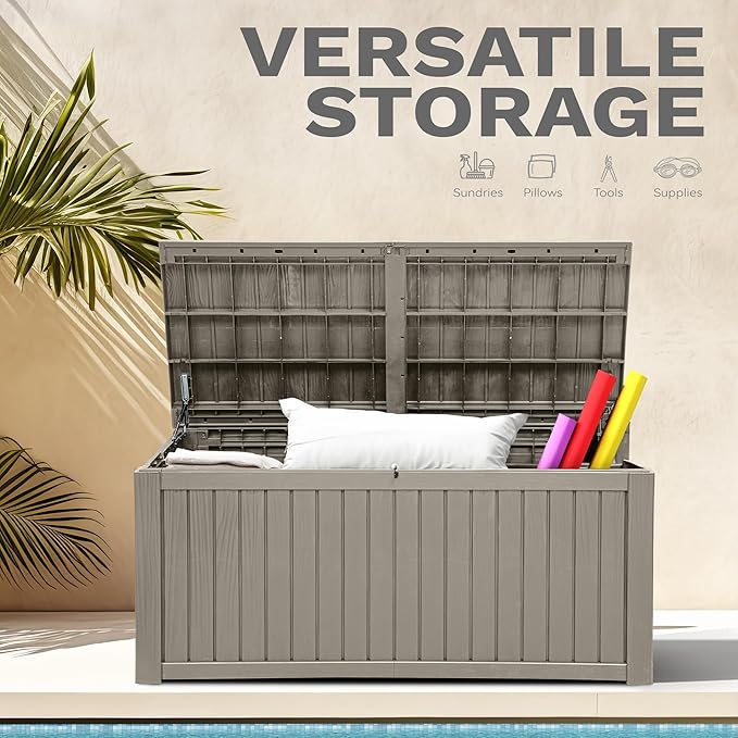 - Spacious & Stylish Storage Solution: Upgrade your patio with this 150-gallon outdoor storage box; Its extra-large capacity easily stores cushions, tools, sports equipment, and more, making it a must-have for any yard, garage, or poolside setup