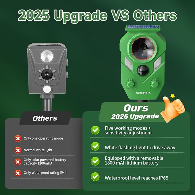 - Solar powered and waterproof: The Ultrasonic Animal Repeller is charged by solar energy for energy saving and environmental protection, IP65 waterproof, even in extreme outdoor environments, with a very low failure rate and easy to maintain