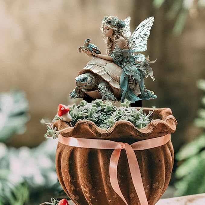 Fairy Garden Stake Decor, 2D Flat Acrylic Fairy Garden Decor Panel, Elf Yard Sign for Outdoor Indoor Yard Lawn Plants Pots, Fairy Garden Accessories (Fairy and Turtle)