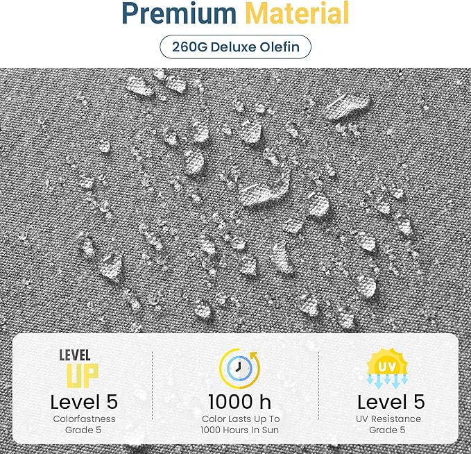 - Upgraded Cushions: This cushion, crafted from 260G deluxe Olefin fabric, blends style and functionality. With a color fastness rating of 5, its vibrant colors stay bright even after prolonged sun exposure. The soft, skin-friendly texture is ideal for homes with kids and pets, ensuring comfort and safety. Additionally, the precise stitching and high-quality inner lining showcase fine craftsmanship, adding elegance to every detail.