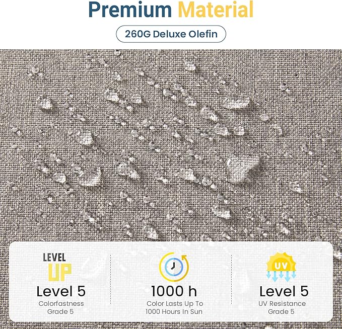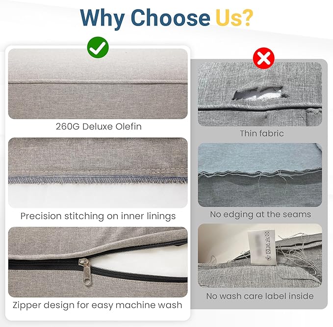 - Upgraded Cushions: This cushion, crafted from 260G deluxe Olefin fabric, blends style and functionality. With a color fastness rating of 5, its vibrant colors stay bright even after prolonged sun exposure. The soft, skin-friendly texture is ideal for homes with kids and pets, ensuring comfort and safety. Additionally, the precise stitching and high-quality inner lining showcase fine craftsmanship, adding elegance to every detail.