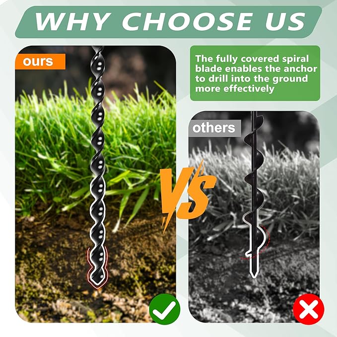 - HEAVY DUTY GROUND ANCHORS: Our ground anchors are made of high-quality metal and coated with black paint to minimize rust. The fully welded spiral design enhances durability and longevity, while the rounded edges provide better support in the soil.