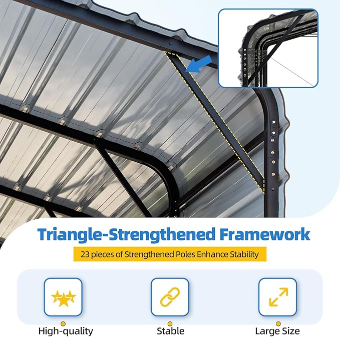 - Superior Weather Resistance: Designed with a sturdy triangular roof structure, reinforced crossbars, and steel wire cables, this carport withstands winds up to 100 MPH and snow loads of 35 PSF. High-density waterproof tape and rubber edge protectors ensure leak-proof performance and safety, providing reliable protection for your vehicles in extreme weather conditions