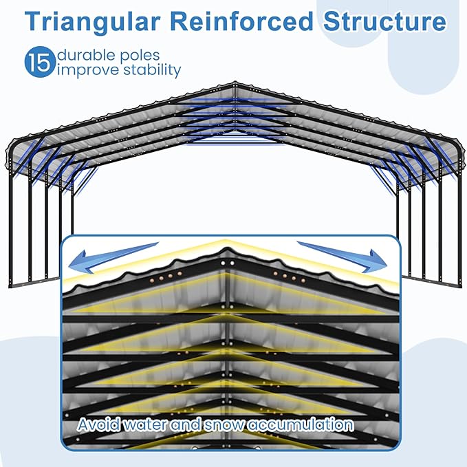 - Durability and Protection: Our carport features 15 reinforced cross beams, 10 rust-resistant powder-coated 2''x2'' steel poles, and a high-strength galvanized steel roof with 0.5 mm thick panels. The roof includes a drainage system for smooth runoff, and the joints are sealed with waterproof tape to prevent leaks