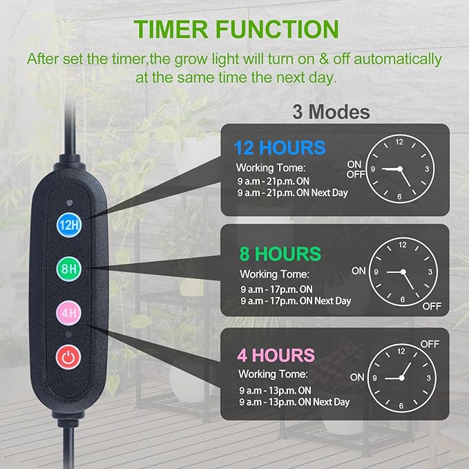 - Set It & Forget It!---Program your grow cycle in seconds – choose 4, 8, or 10 hours of automatic daily lighting. Perfect for work trips or forgetful plant parents!