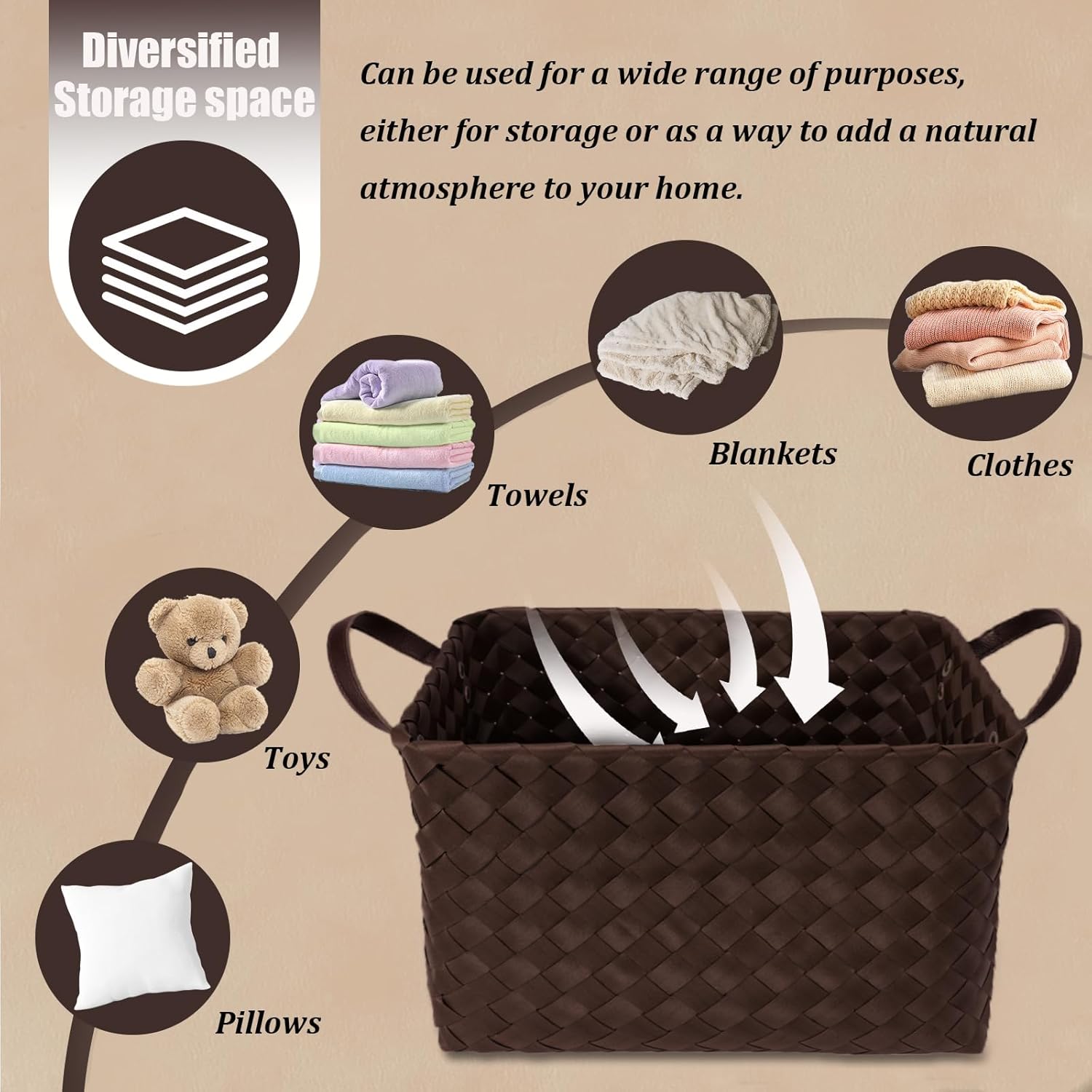 - ăMultiple-Use Storage BasketăThese baskets for organizing help maintain daily cleanliness like blankets, clothesďźpillows and toys. Great for using in the bathroom, bedroom, nursery, bedroom, living room, guest room, kitchen, office etc.