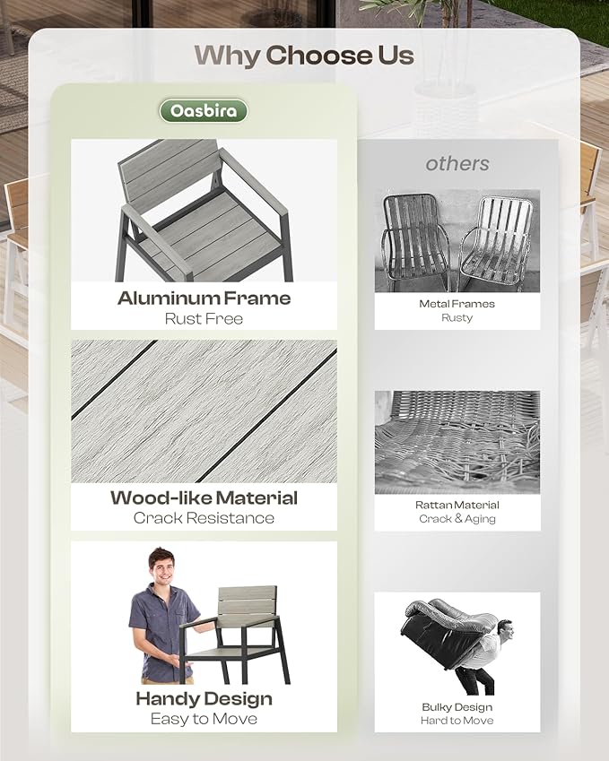 - 【Premium Materials】This patio dining set features an aluminum frame with weather-resistant coatings, which make it lighter and stronger than iron. Also, its HDPS wood-like panels are UV-resistant and fade-proof, ensuring long-lasting beauty. Compared to conventional metal furniture, Oasbira outdoor dining sets are more sturdy and ideal for outdoor use.