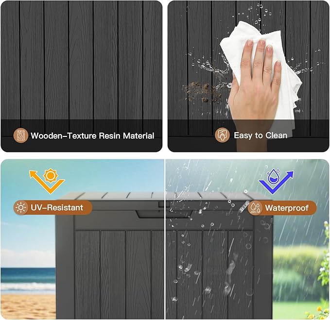 - All-Weather Protection: Crafted with high-density UV-resistant resin and wood-grain finish, this deck box withstands rain, snow, and sun without fading, rusting, bending or scratches - ideal for long-term outdoor use