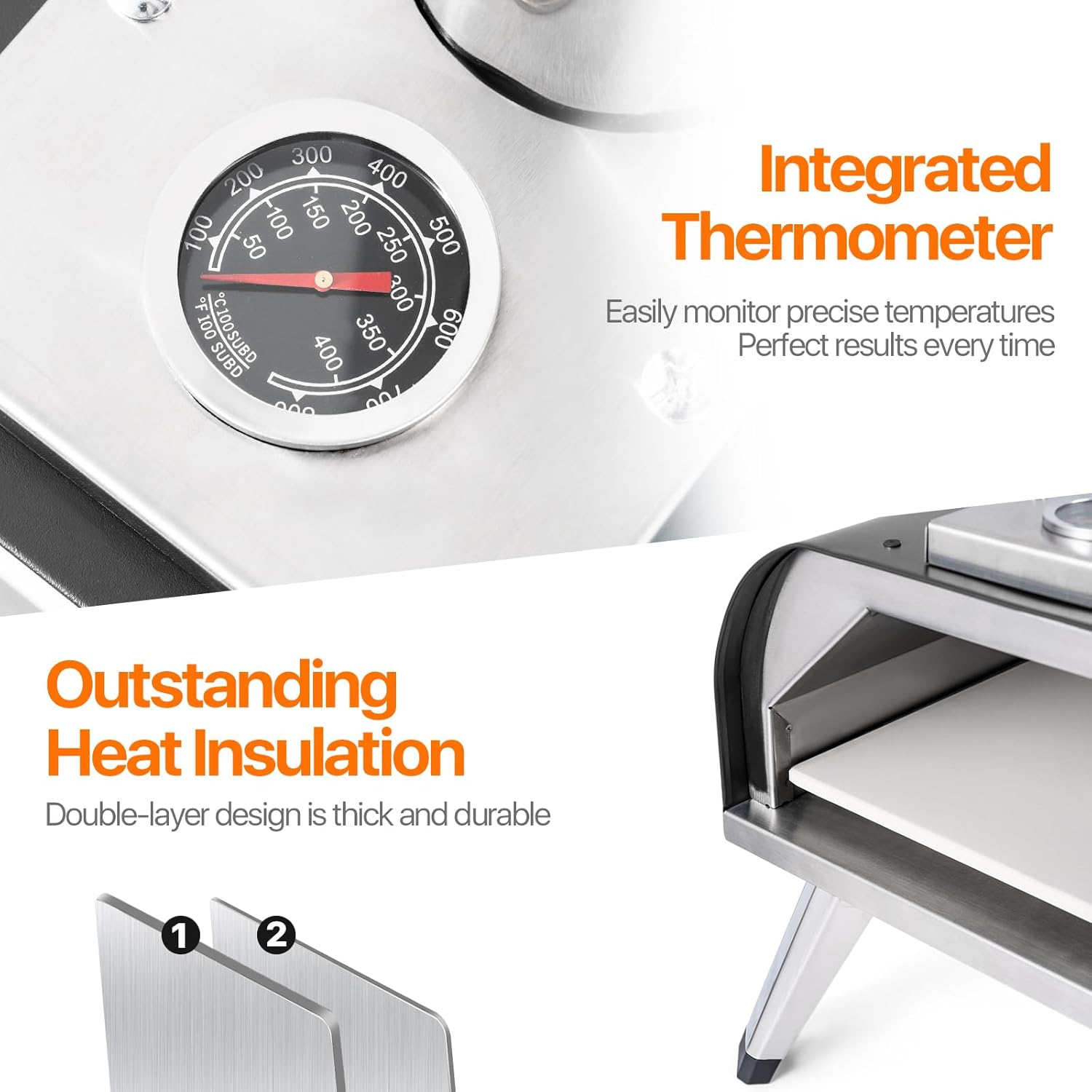 - Done in Minutes: Our outdoor pizza oven has a built-in thermometer so you can easily monitor the temperature inside the oven to track cooking progress. Heats up to 752°F in just 15 minutes and reaches a maximum temperature of 1,022°F. When preheated, the 13'' cordierite pizza stone bakes pizzas to crispy perfection in 90 seconds or less, as well as steaks, fish, lamb chops, burgers, salmon, vegetables and more