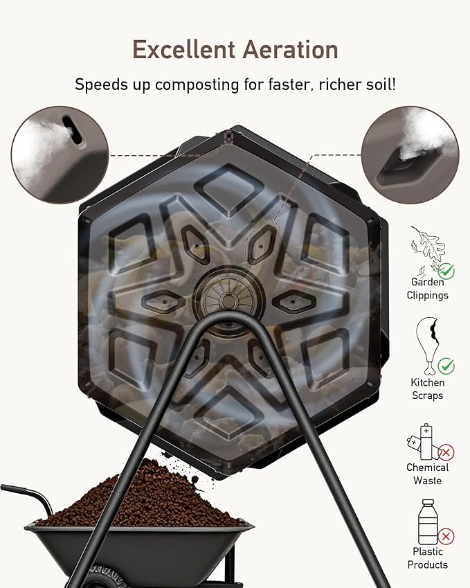 - Fast Aeration & Mixing – Ready in Weeks: Internal air vents ensure proper oxygen flow, helping your scraps break down faster. With the built-in compost turner design, all you need is a spin to mix the contents. Combined with its heat-absorbing black and brown exterior, this tumbler compost bin speeds up the composting cycle naturally. Whether you’re a beginner or a pro, it’s a reliable outdoor compost bin tumbler or compost barrel that gets the job done fast.