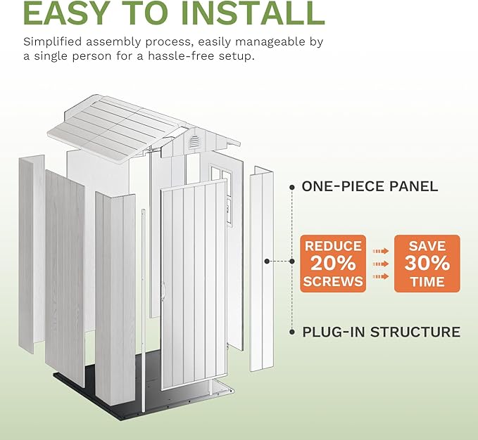 - Easy Installation: Creative designed One-Piece Panel Plug-In Construction reduces screws by 20%, which directly saves 30% of installation time, allowing you to assemble our sheds conveniently with just ONE PERSON.