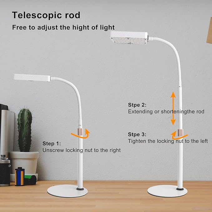 - 【Stable Base and Adjustable Height Stand】This desk grow light with base and stand, you can stand it on desk and adjust the lamp head height according to your application from 16” to 24”.