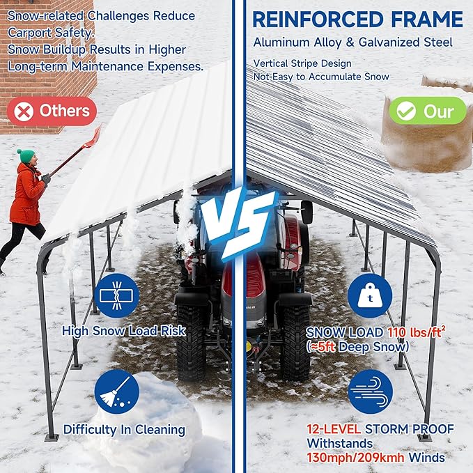 - All-Weather Durability: Engineered to endure extreme weather conditions, including heavy snow and strong winds. Reinforced framework with heavy-duty materials provides reliable year-round protection.
