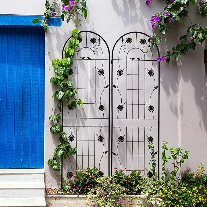 - Multi Purpose Garden Trellis: This outdoor garden trellis provides support for climbing plants, such as ivy, rose, cucumber. The black garden metal trellis can be used to form privacy screens.