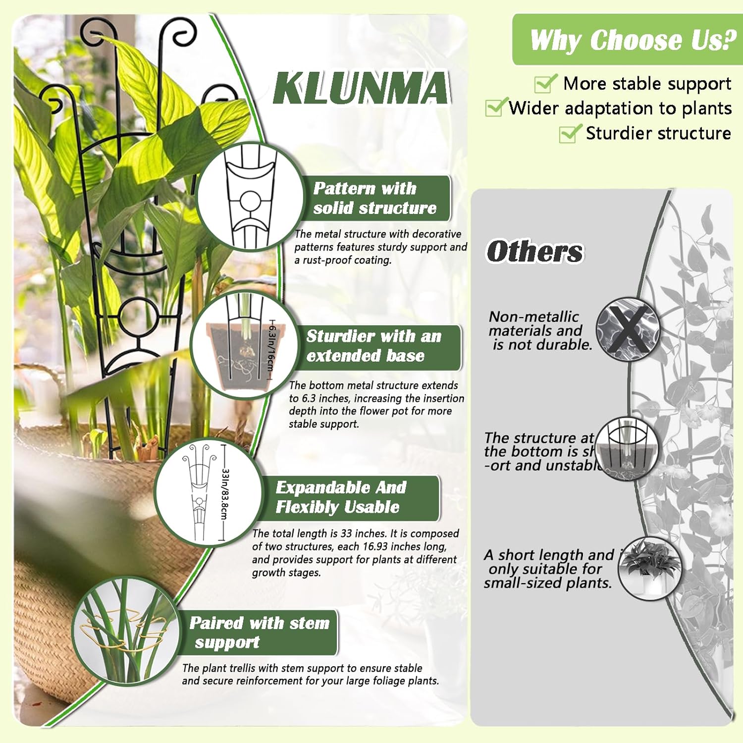 - Perfect Support– Our indoor plant trellis can support taller climbing plants (33 inches), which is 28% taller than standard plant stands. The plant trellis indoor provide essential support for a wide variety of climbing plants such as ivy,monstera plant, pothos, peace lilies, mini mandevilla, morning glories, and pea vines. The complete set includes two metal trellises, one monstera stem support, and 20 plant ties.