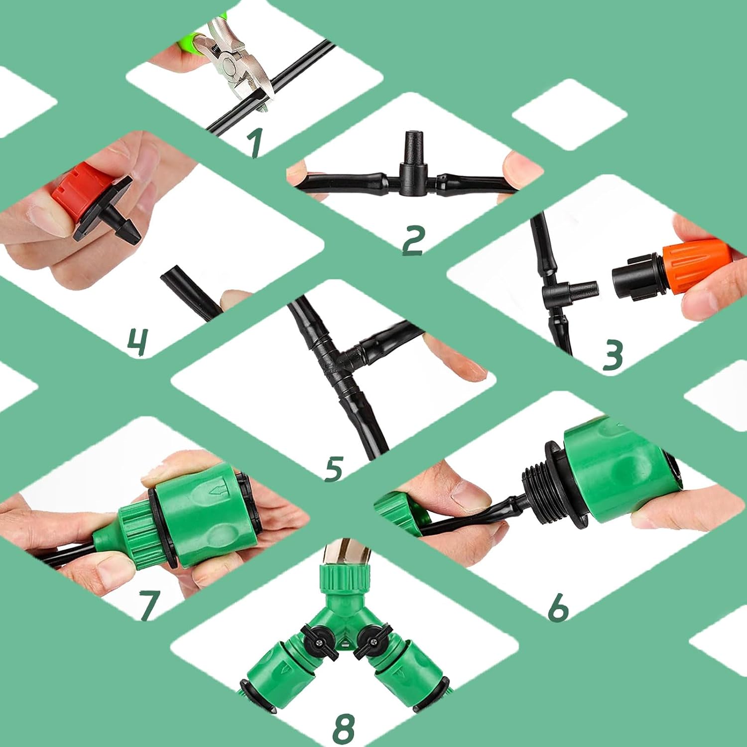 - Smart Modular Configuration: ANSIKE Drip Irrigation Systems are equipped with a variety of components in a modular design. Includes essential parts such as 164ft 4/7'' irrigation tube, 1/2‘’ Lock Barbed Tee connectors, vortex emitters, drip emitter streams, Blue Red Mist Nozzles, Faucet Connector, Quick connection tees, and more.