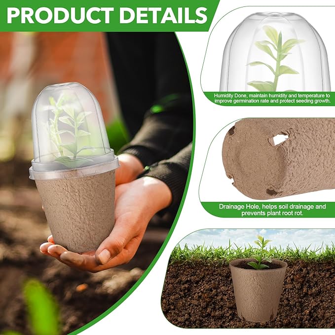 - Sturdy Materials: the are made of recycled pulp and adhesives, and the seedling covers is made of plastic, ensuring durability and sustainability, making it an friendly choice for friendly gardening enthusiasts; The clear plastic dome is reusable and provides excellent visibility, allowing you to monitor plant growth without disturbing the environment