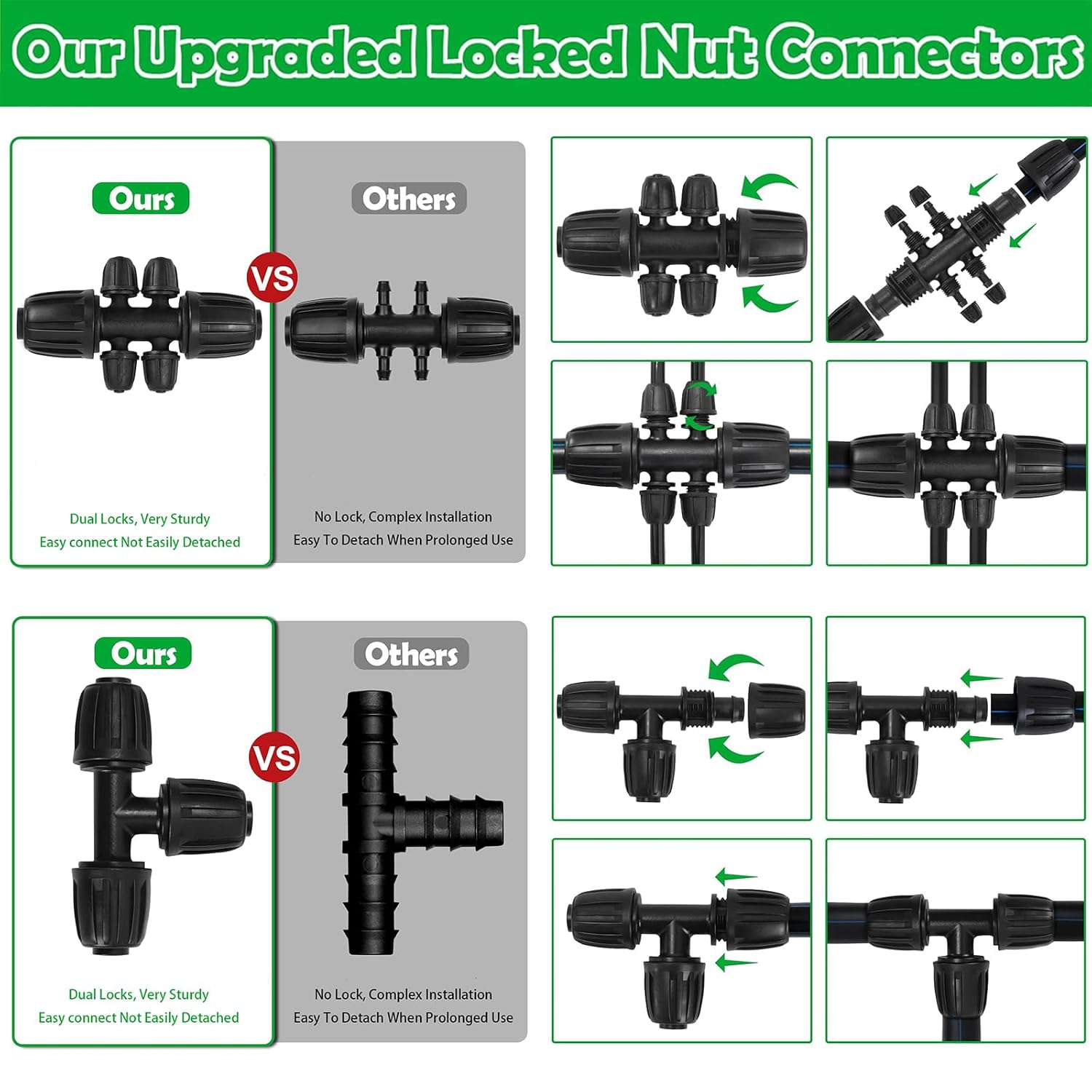 - Upgraded Quick Connect Design, Efficiency Boost: The 4-way connector, tee, and emitter of our garden drip irrigation system feature upgraded locked nut design, make them easy to connect with 1/4" irrigation tubing; what's more, the 360Β° tight structure of these dual locked nut ensures pipes stay firmly locked, resistant irrigation tubing loosening or detachment when dripping, sprinkling, misting, even in high-pressure water, ensure the garden irrigation system working well in any time and any place.