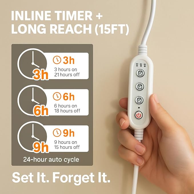 - 【Easy to Install, Safe to Use】: Plug it in and grow—no hard wiring needed. Comes with a built-in 24-hour cycle timer (3h/6h/9h options) and a 15ft power cord, so you can place it wherever your plants need light. The full aluminum housing keeps it cool and safe, with excellent heat dissipation for long-term use.