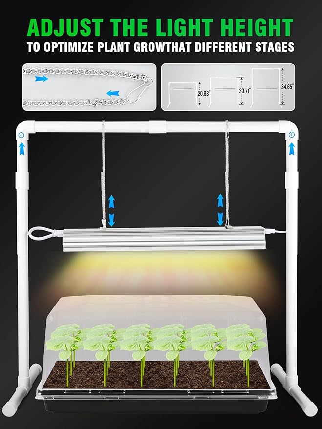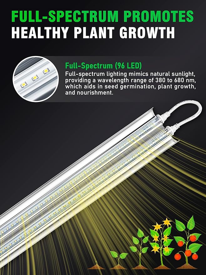 - FULL-SPECTRUM LED PLANT GROW LIGHT: Full-spectrum (96 LED) lighting mimics natural sunlight, providing a wavelength range of 380 to 680 nm to support seed germination, plant growth, and nourishment. And with a height-adjustable grow light stand, this setup allows easy adjustment of light height to optimize plant growth at various developmental stages.