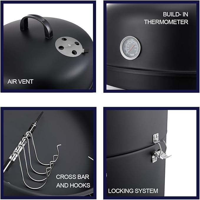 - Portable & Lockable Modular System - The barrel smoker body separates into stackable layers with secure clamp latches and side handles. Whether tailgating or camping, this charcoal smoker grill moves easily and stores compactly in your car trunk.