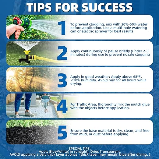 - ā±ļø Effortless Application& No-Clog, User-Friendly Design! Simply dilute with water, spray evenly, and let dry ā our blue-tint formula makes coverage visible, then dries clear. For best results, apply 2-3 coats with drying time in between and lightly rake gravel after the first layer. Works with any standard sprayer when properly diluted (20-50% water), preventing clogs while ensuring strong, lasting adhesion for your landscaping needs.