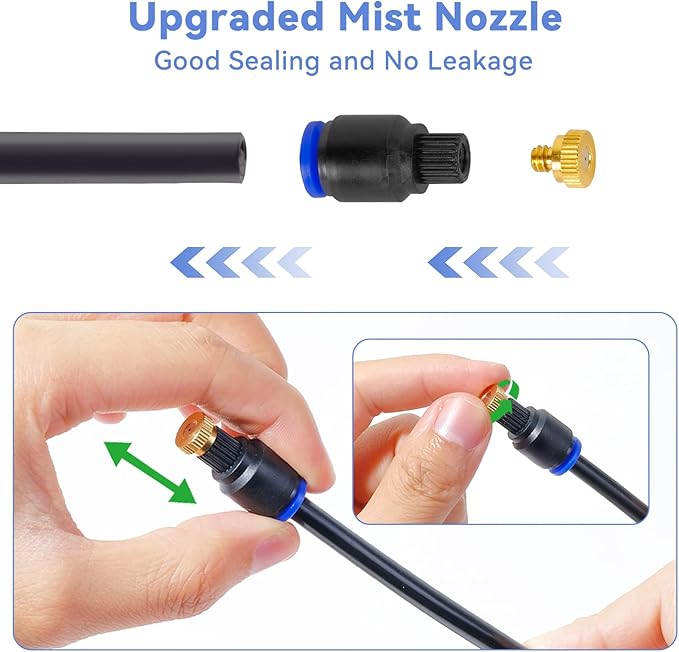 - ENHANCED LEAK-PROOF DESIGN: The water misting cooling system includes a roll of Teflon tape to seal connections between the extension pipe, vertical tubing, and faucet, ensuring a watertight fit and minimizing leakage risks for long-lasting durability. Additionally, a built-in filter screen is installed at the misting line's connection point to block debris and prevent nozzle clogging, maintaining consistent mist output over time.
