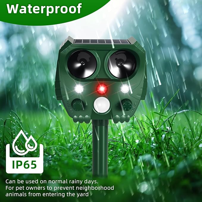 - Solve 99% of Animal Invasion Worries: This ultrasonic repellent outdoor uses advanced microelectronics to emit alternating high-pressure and ultrasonic waves (13.5KHz-45.5KHz). With LED strobe lights, it disrupts animal vision in areas, creating a highly unpleasant environment.The combination of sound waves and visual interference targets an animal's auditory and nervous systems, making them uncomfortable and driving them away