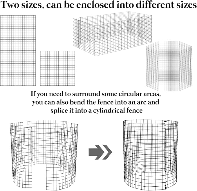 - DIY Plant Cage In Various Shapes: You can assemble 3 mesh into a cylinder assembled plant cage, or 4 pieces into a rectangular protection cage, or even more mesh into a larger plant wire cage to protect your plants from harm, use the wire ties included in the package to tie up, circle the plant and then fix it with metal stakes, very simple to install and easy to use.