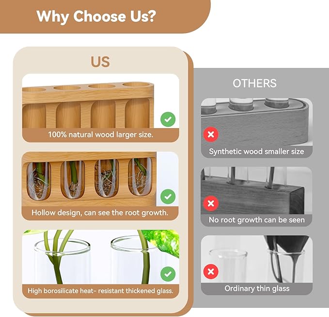 - Complete Propagation Solution & Thoughtful Gift - Includes wood stand, 4 tubes, screws, and manual. Ships in gift-ready box. Perfect for planting starters, displaying small cuttings, or gifting to plant lovers on birthdays/Mother’s Day.
