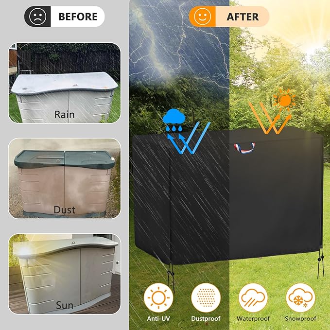 - Weather-Resistant Material:Made with 420D oxford fabric and a waterproof undercoating, this patio storage box cover provides superior protection against harsh weather conditions, keeps your rubber made storage shed safe from rain, snow, dust, and dirt.