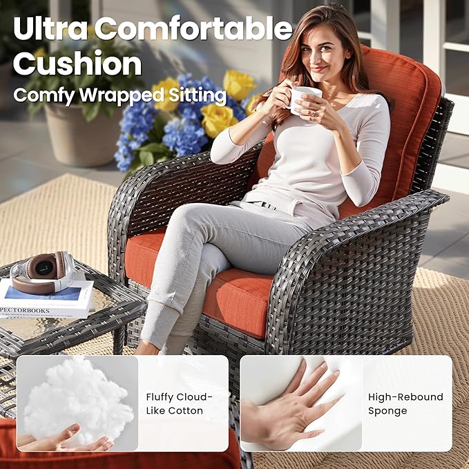 - 360° Swivel & 30° Gliding Rocking: The chairs feature a dual-function design: smoothly rotate 360° for effortless conversation or enjoy a gentle 30° gliding rock to relax and unwind, adding versatility to your outdoor experience. Ergonomic deep seating is designed for comfort, the spacious deep seats and wide armrests offer optimal support