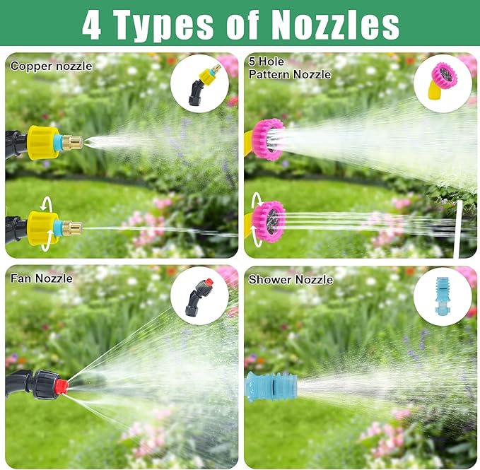 - 4 Adjustable Nozzles: This garden sprayer is equipped with 4 nozzles: copper nozzle, fan nozzle, 5-hole nozzle, shower nozzle; By rotating the nozzles, you could switch between fine mist for delicate plants, fan spray for broad coverage, or jet spray for stubborn stains; Designed for weed sprayer precision or broad coverage, it adapts to fertilizers, weed control, or cleaning tasks