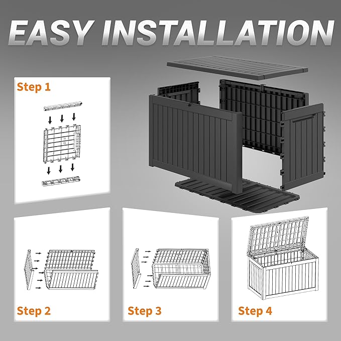 - ☔ Weatherproof & Durable Construction Built with high-quality resin, this waterproof deck box offers superior protection against UV rays, rain, snow, and extreme temperatures. Its fade-resistant and rustproof design ensures longevity, while the double-wall construction adds extra sturdiness. No matter the season, your outdoor storage container will maintain its sleek look while keeping your items dry and well-protected.