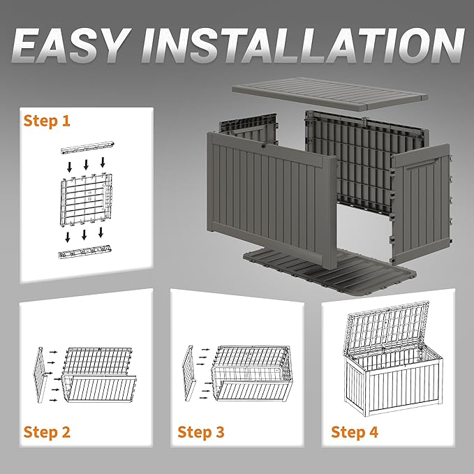 - ☔ Weatherproof & Durable Construction Built with high-quality resin, this waterproof deck box offers superior protection against UV rays, rain, snow, and extreme temperatures. Its fade-resistant and rustproof design ensures longevity, while the double-wall construction adds extra sturdiness. No matter the season, your outdoor storage container will maintain its sleek look while keeping your items dry and well-protected.