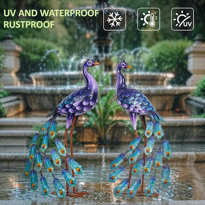 - Exquisite Hand-Painted Peacocks: Standing at 31.8" (head raised) and 31.2" (head down), these metal peacock statues feature vibrant purple hues with intricate hand-painted feather details. The 16.4" widths, realistic purple tail, creates a dramatic visual impact in any outdoor setting.