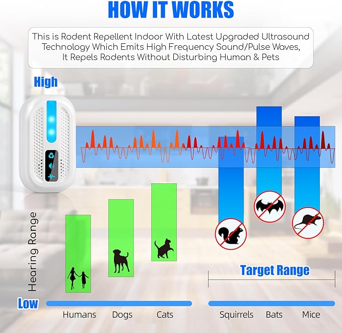 - How rodent repellent ultrasonic plug in work: Ultrasonic waves disturb pests’ brain signals. Constant sound exposure affects their nerve system. Over time, they leave the area due to the stress on their neurons